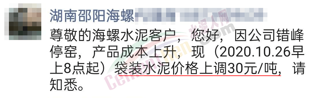 邵陽海螺通知,因公司錯(cuò)峰停窯,產(chǎn)品成本上升,自10月26日早8點(diǎn)起袋裝水泥價(jià)格上調(diào)30元/噸。
