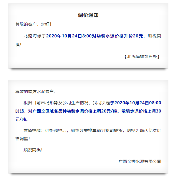 同期,相鄰區(qū)域廣西自治區(qū)主要品牌企業(yè)華潤水泥、海螺水泥等繼續(xù)發(fā)布漲價(jià)通知。