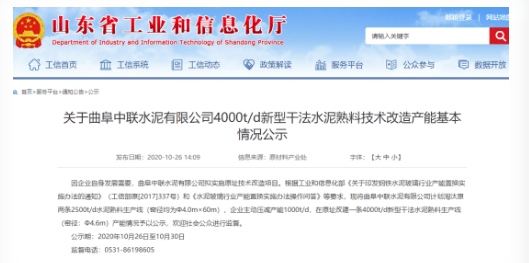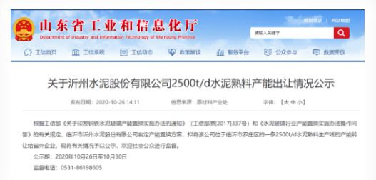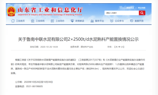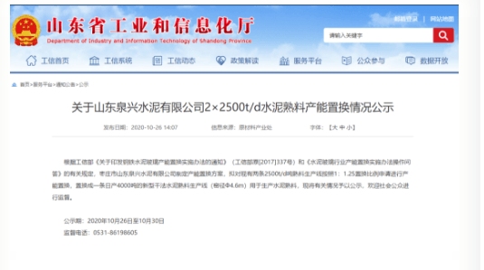 山東省工信廳近期布公示文件稱(chēng)現(xiàn)有兩條2500t/d熟料生產(chǎn)線(xiàn)按照1:1.25置換比例申請(qǐng)進(jìn)行產(chǎn)能置換,置換成一條日產(chǎn)4000噸的新型干法水泥熟料暨協(xié)同處置污染土壤生產(chǎn)線(xiàn)(窯徑Ф4.6m)。公示期為2020年10月26日至10月30日。