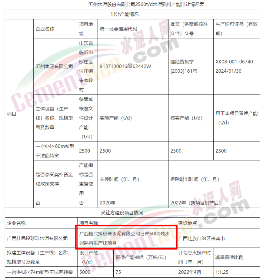 根據(jù)有關(guān)規(guī)定文件要求,臨沂市沂州水泥股份有限公司制定產(chǎn)能置換方案,擬將該公司位于臨沂市羅莊區(qū)的一條2500t/d水泥熟料生產(chǎn)線(xiàn)的產(chǎn)能轉(zhuǎn)讓給廣西桂民投珍珠水泥有限公司,用于新建一條日產(chǎn)5000噸水泥熟料生產(chǎn)線(xiàn)(Φ4.8×74m新型干法回轉(zhuǎn)窯)。建設(shè)地點(diǎn)位于廣西壯族自治區(qū)來(lái)賓市。新建線(xiàn)計(jì)劃點(diǎn)火投產(chǎn)時(shí)間為2022年4月,減量置換為例為1:1.25。公示期為2020年10月26日至10月30日。