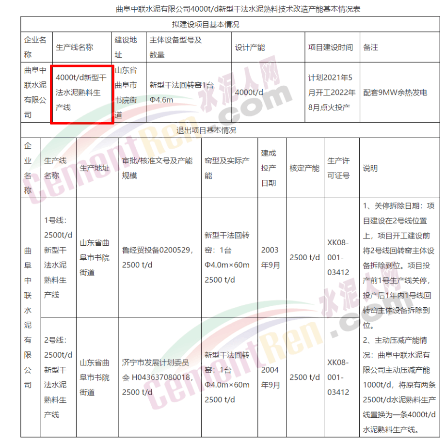 三、曲阜中聯(lián)計(jì)劃淘汰原兩條2500t/d水泥熟料生產(chǎn)線(xiàn),主動(dòng)壓減產(chǎn)能1000t/d,原址改建一條4000t/d新型干法水泥熟料生產(chǎn)線(xiàn)