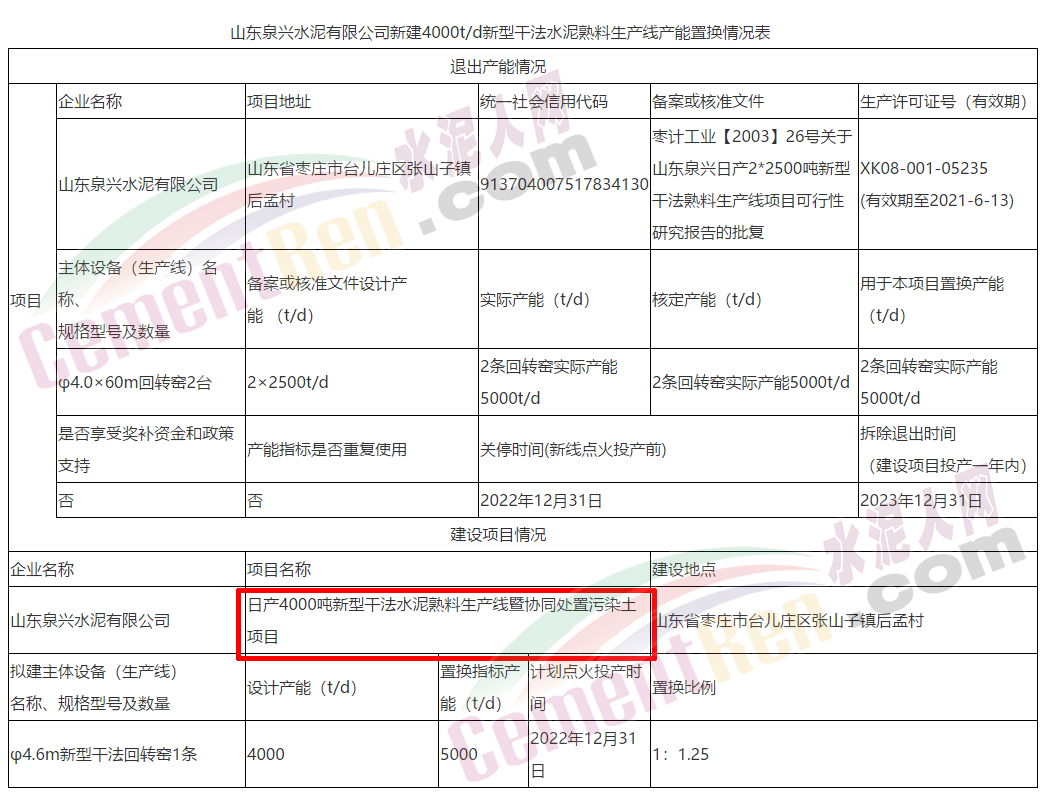 四、棗莊市山東泉興水泥擬退出兩條2500t/d噸熟料生產(chǎn)線(xiàn),用于新建一條日產(chǎn)4000噸的新型干法水泥熟料生產(chǎn)線(xiàn)。根據(jù)工相關(guān)文件規(guī)定,棗莊市山東泉興水泥有限公司制定產(chǎn)能置換方案,擬對(duì)現(xiàn)有兩條2500t/d噸熟料生產(chǎn)線(xiàn)按照1:1.25置換比例申請(qǐng)進(jìn)行產(chǎn)能置換,置換成一條日產(chǎn)4000噸的新型干法水泥熟料生產(chǎn)線(xiàn)(窯徑Ф4.6m)用于生產(chǎn)水泥熟料。