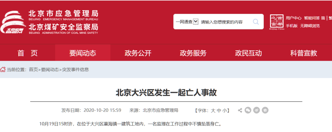 10月19日15時(shí)許,在位于大興區(qū)瀛海鎮(zhèn)一建筑工地內(nèi),一名監(jiān)理在工作過程中不慎墜落身亡。