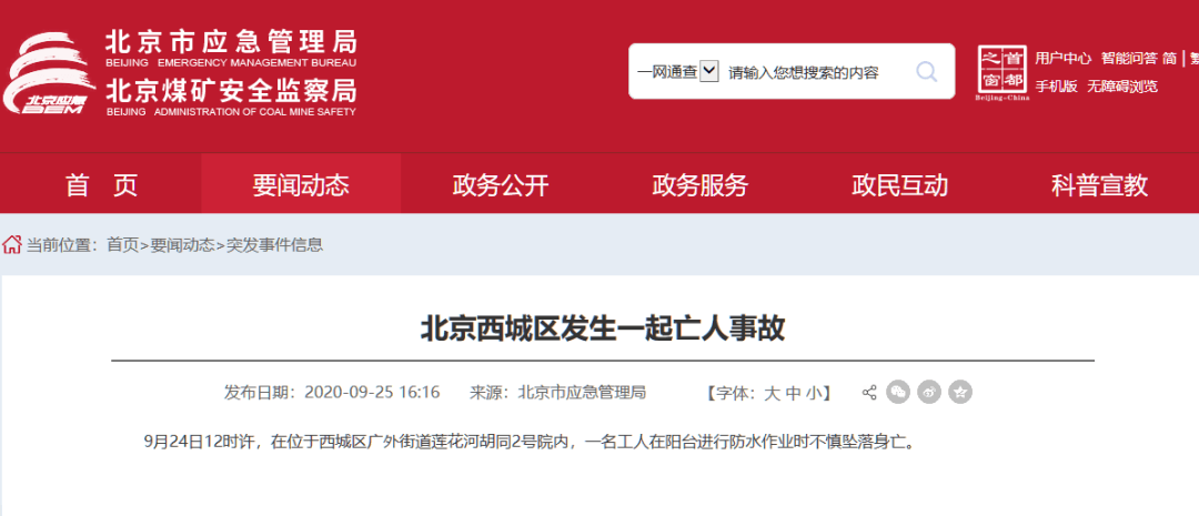 9月24日12時(shí)許,在位于西城區(qū)廣外街道蓮花河胡同2號(hào)院內(nèi),一名工人在陽(yáng)臺(tái)進(jìn)行防水作業(yè)時(shí)不慎墜落身亡。
