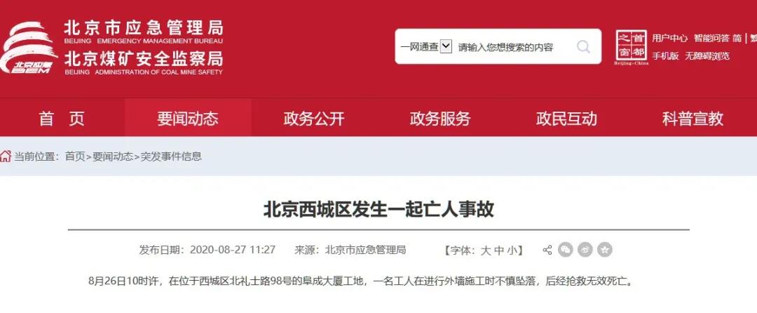 8月26日10時(shí)許,在位于西城區(qū)北禮士路98號(hào)的阜成大廈工地,一名工人在進(jìn)行外墻施工時(shí)不慎墜落,后經(jīng)搶救無效死亡。