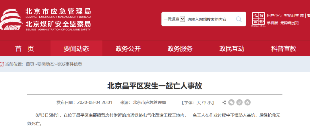 8月3日5時(shí)許,在位于昌平區(qū)南邵鎮(zhèn)營(yíng)房村附近的京通鐵路電氣化改造工程工地內(nèi),一名工人在作業(yè)過程中不慎墜入基坑,后經(jīng)搶救無效死亡。