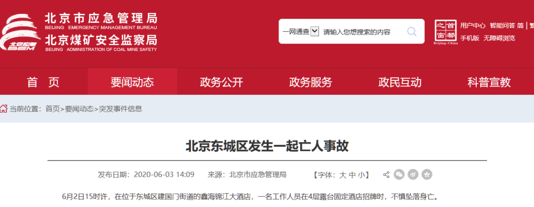 6月2日15時(shí)許,在位于東城區(qū)建國(guó)門街道的鑫海錦江大酒店,一名工作人員在4層露臺(tái)固定酒店招牌時(shí),不慎墜落身亡。