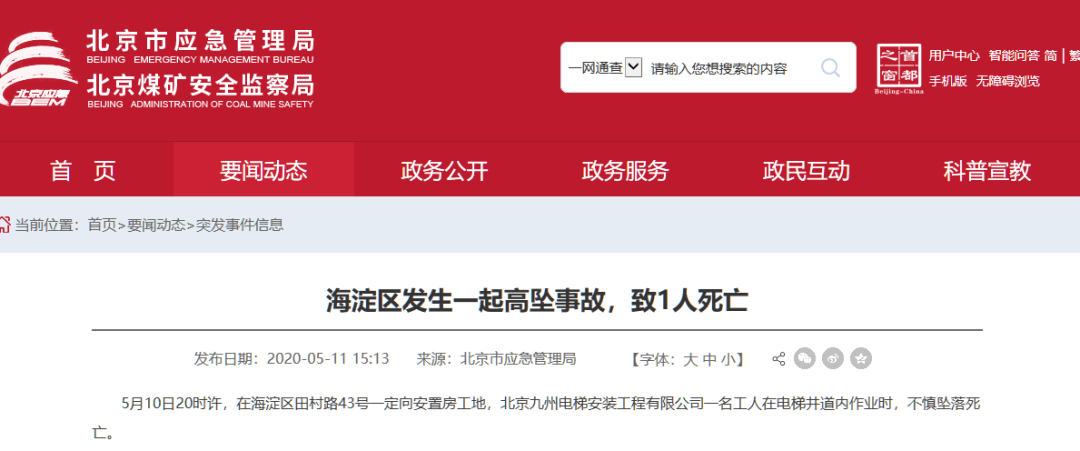 5月10日20時(shí)許,在海淀區(qū)田村路43號(hào)一定向安置房工地,北京九州電梯安裝工程有限公司一名工人在電梯井道內(nèi)作業(yè)時(shí),不慎墜落死亡。