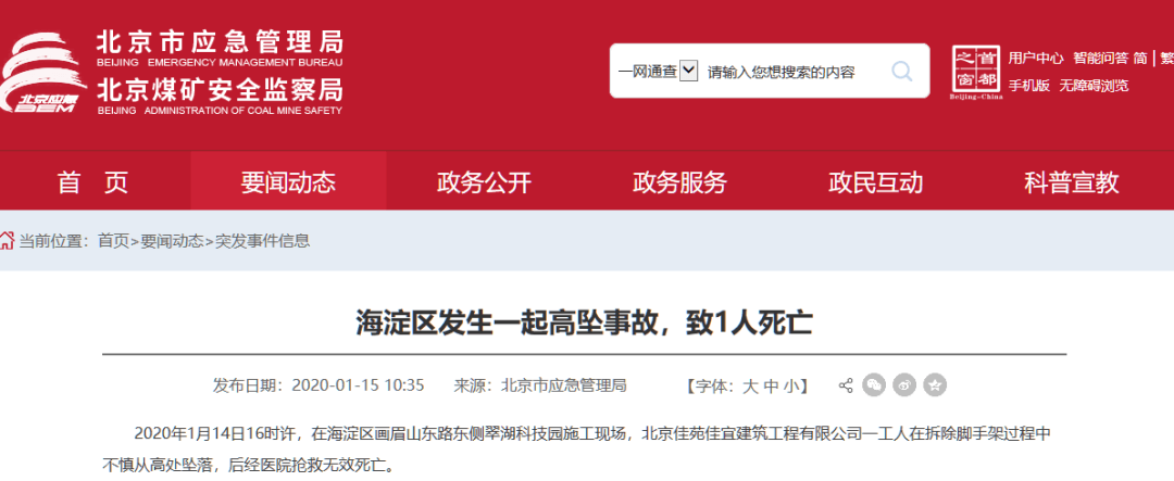 1月14日16時(shí)許,在海淀區(qū)畫眉山東路東側(cè)翠湖科技園施工現(xiàn)場(chǎng),北京佳苑佳宜建筑工程有限公司一工人在拆除腳手架過程中不慎從高處墜落,后經(jīng)醫(yī)院搶救無效死亡。
