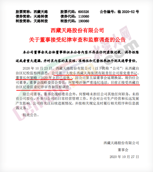 10月27日,西藏天路發(fā)布公告稱,公司10月23日從西藏自治區(qū)紀(jì)檢監(jiān)察網(wǎng)獲悉,公司第二大股東西藏天海集團(tuán)有限責(zé)任公司原黨委書記、董事長(zhǎng)何黎峰(2020年9月已退休),因公司第五屆董事會(huì)延期換屆,現(xiàn)仍任公司董事、董事會(huì)戰(zhàn)略委員會(huì)委員,何黎峰涉嫌嚴(yán)重違紀(jì)違法,目前正接受西藏自治區(qū)紀(jì)委監(jiān)委紀(jì)律審查和監(jiān)察調(diào)查。
