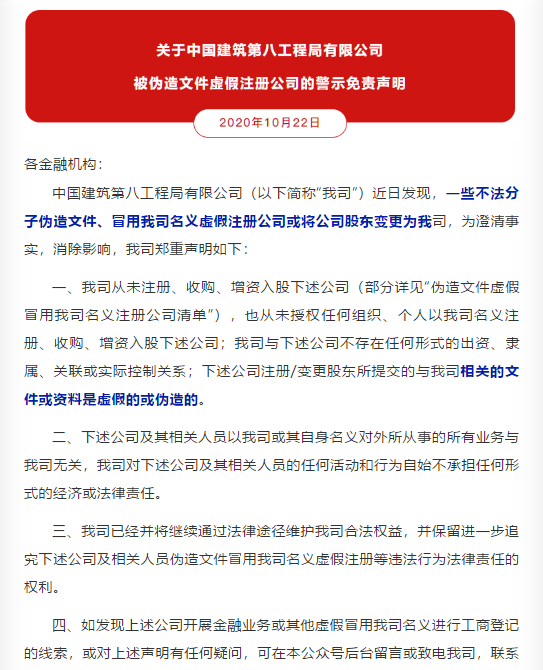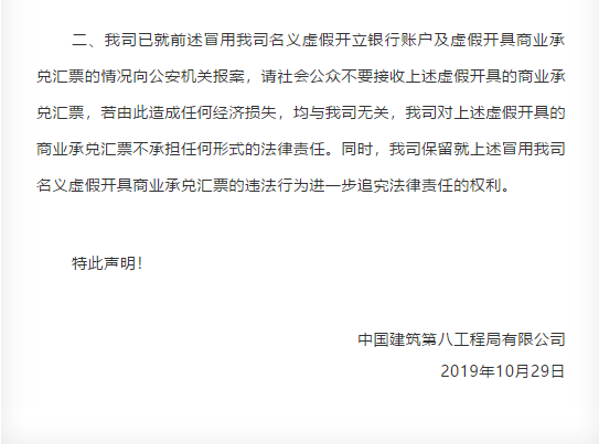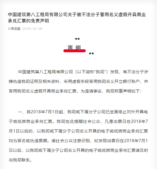 據(jù)水泥人網(wǎng)了解,早在2019年,中國(guó)建筑第八工程局就發(fā)布過被假冒商票的聲明!