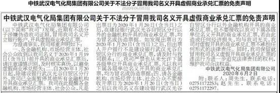 作為一家世界500強(qiáng)企業(yè),中鐵武漢電氣化局集團(tuán)有限公司(下稱“中鐵武漢”)被蹭了名氣。6月初,中鐵武漢對(duì)外公開發(fā)布免責(zé)聲明,稱近期發(fā)現(xiàn)不法分子涉嫌偽造該司證照,冒用其名義開立銀行賬戶,開具虛假商業(yè)承兌匯票。