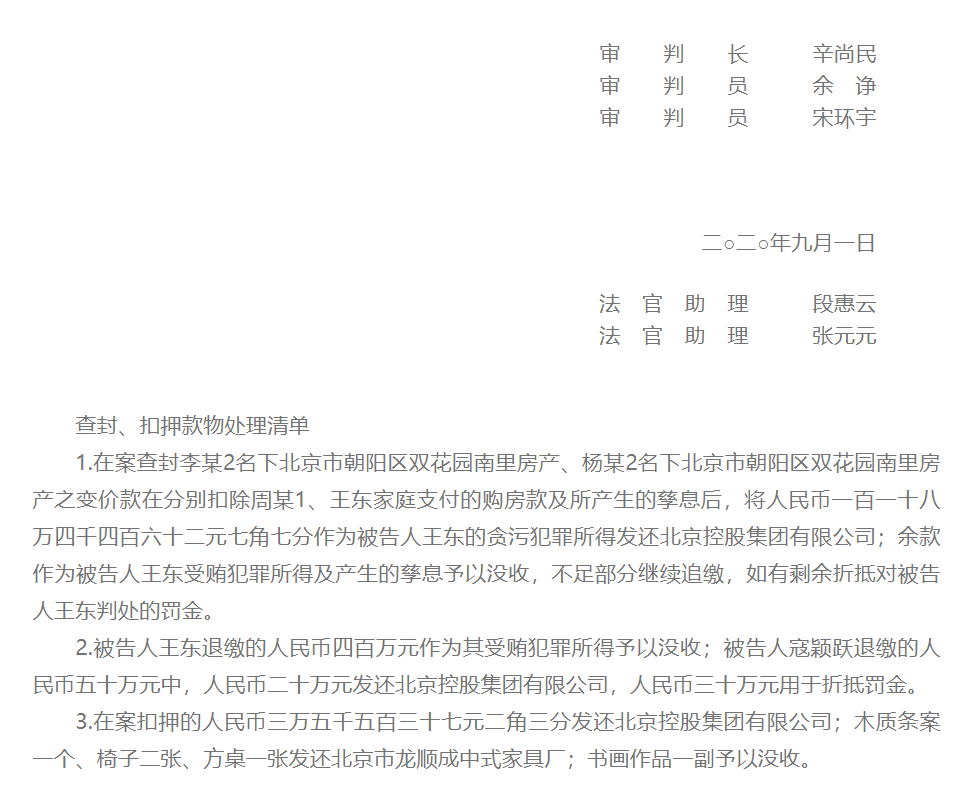 因涉嫌隱瞞境外存歙被告人王東于2019年8月12日接調(diào)查機(jī)關(guān)電話通知后于次日到案,到案后主動(dòng)交代了調(diào)查機(jī)關(guān)尚未掌握的貪污、受賄事實(shí);被告人寇穎躍于2019年8月23日被查獲歸案。案發(fā)后,王東的近親屬代為退繳人民幣400萬元,寇穎躍的近親屬代為退繳人民幣50萬元,涉案贓款人民幣3.553723萬元現(xiàn)扣押在案,辦案機(jī)關(guān)還查封、扣押了涉案房屋二套、家具四件及書畫一幅。