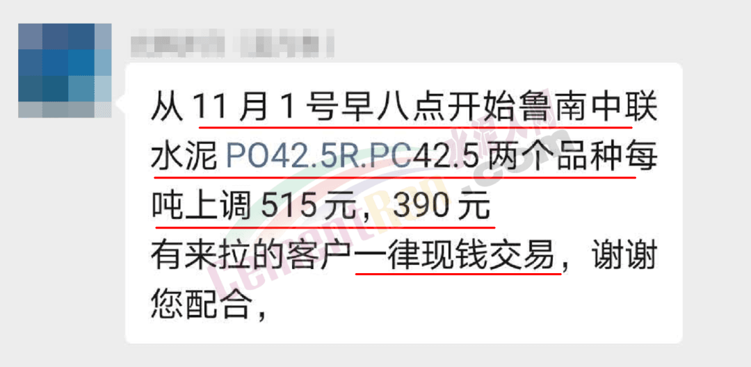 昨日,山東區(qū)域主導企業(yè)中聯(lián)水泥也發(fā)通知稱自11月1日起上調PO42.5R及PC42.5兩個品種水泥價格,上調后PO42.5R水泥執(zhí)行515元/噸,PC42.5水泥執(zhí)行390元/噸。