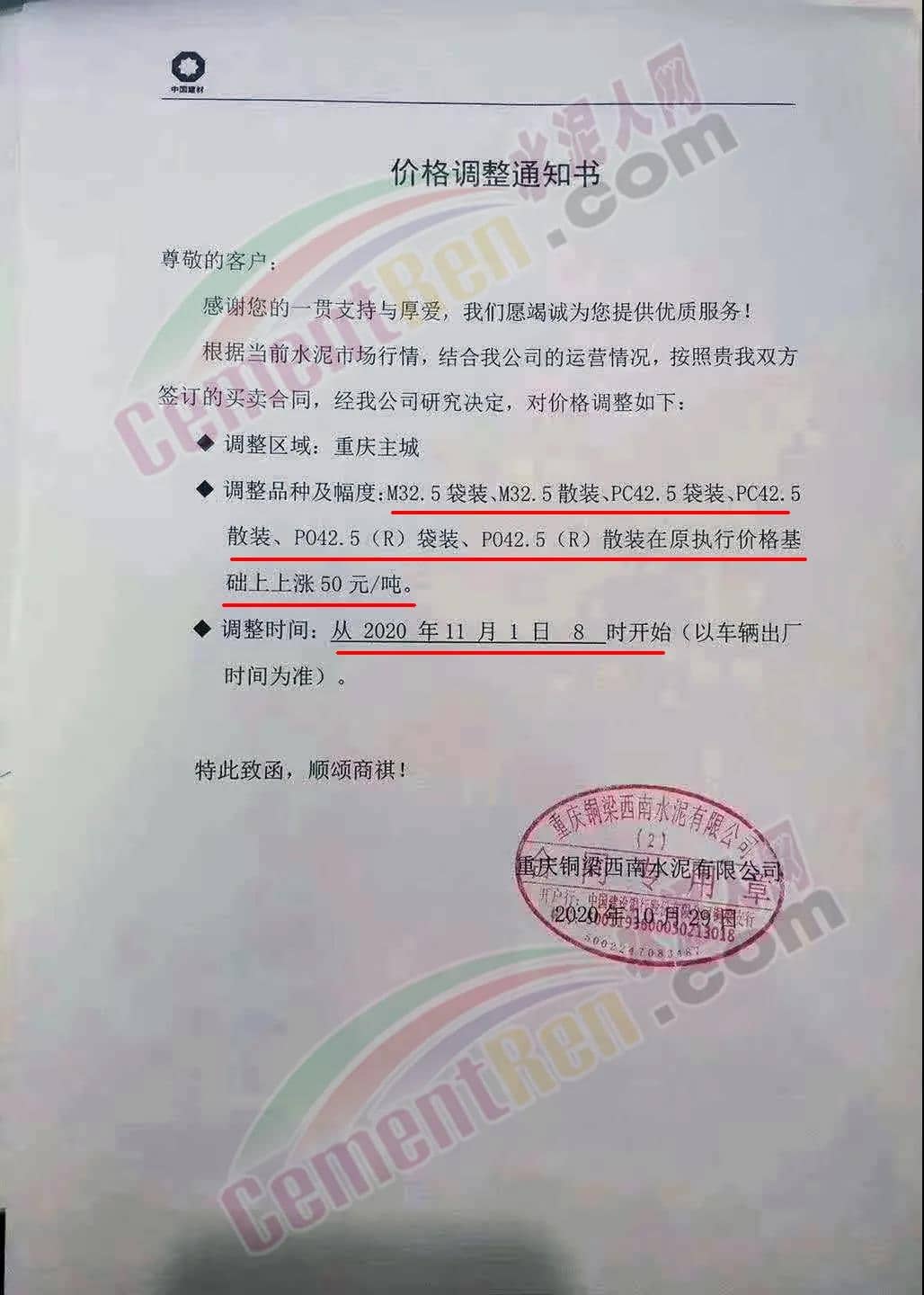 重慶鋼梁西南水泥通知,稱自11月1日早8時起上調各標號水泥價格50元/噸。