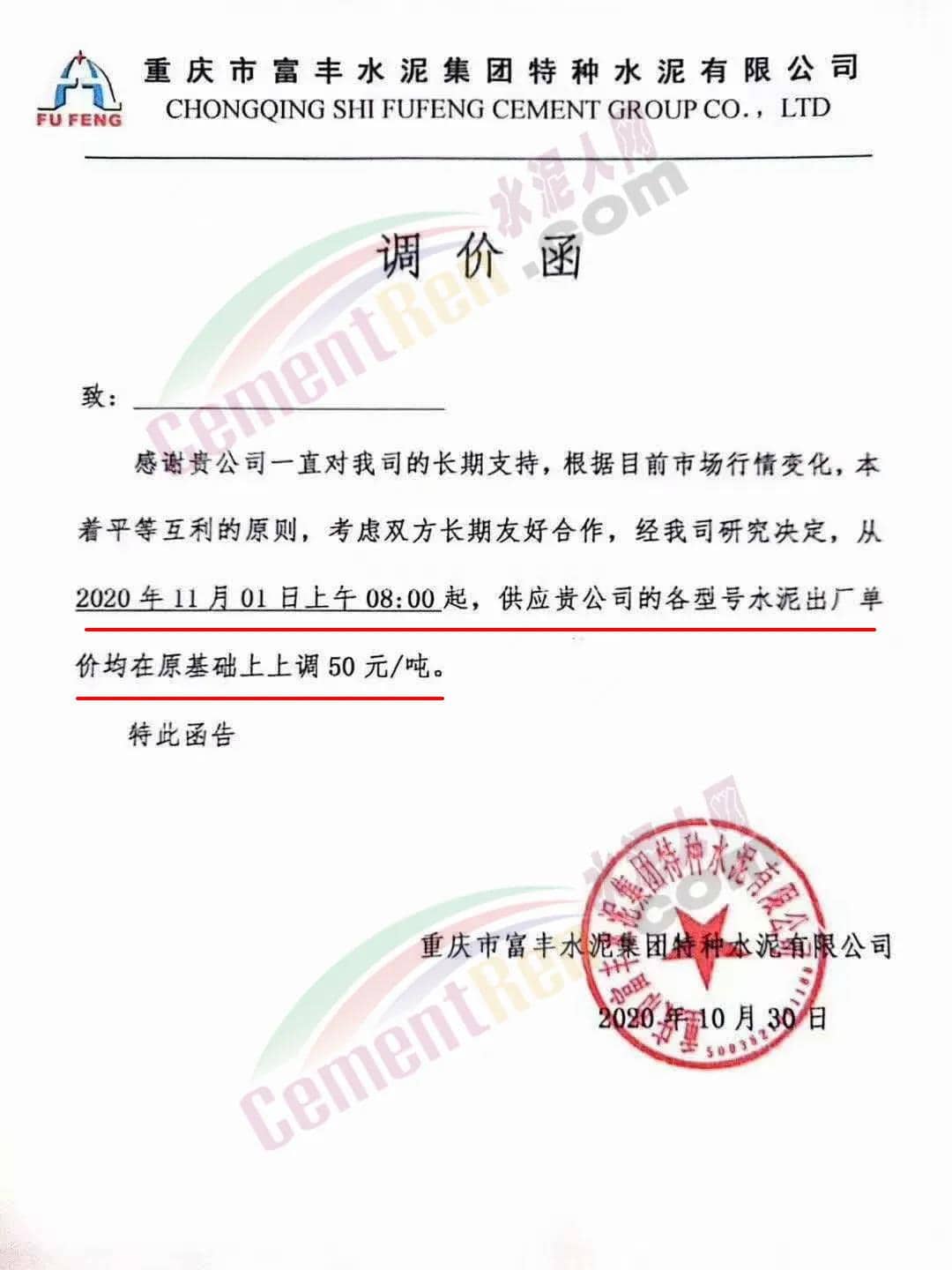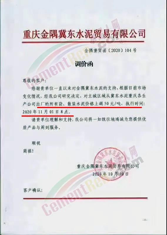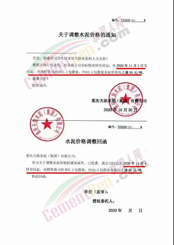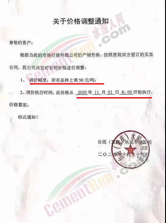 根據市場情況,經研究,決定從2020年11月1日零時起,本公司發(fā)往福建省內各品種各規(guī)格型號水泥在原價格基礎上上調30元/噸。