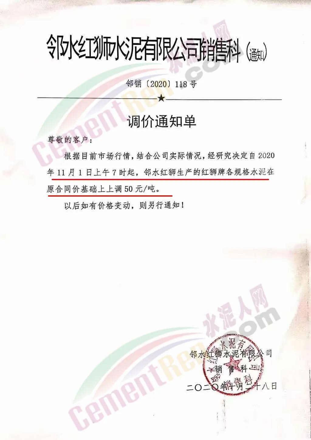 鄰水紅獅水泥銷售科通知自11月1日早7時起,鄰水紅獅生產的紅獅牌各規(guī)格水泥在原合同價基礎上上調50元/噸。