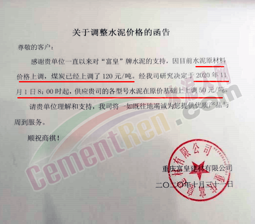 重慶富皇建材有限公司通知,因水泥原材料價格上漲,煤炭已經上調120元/噸,公司決定于11月1日8時起,上調“富皇”水泥各標號價格50元/噸。