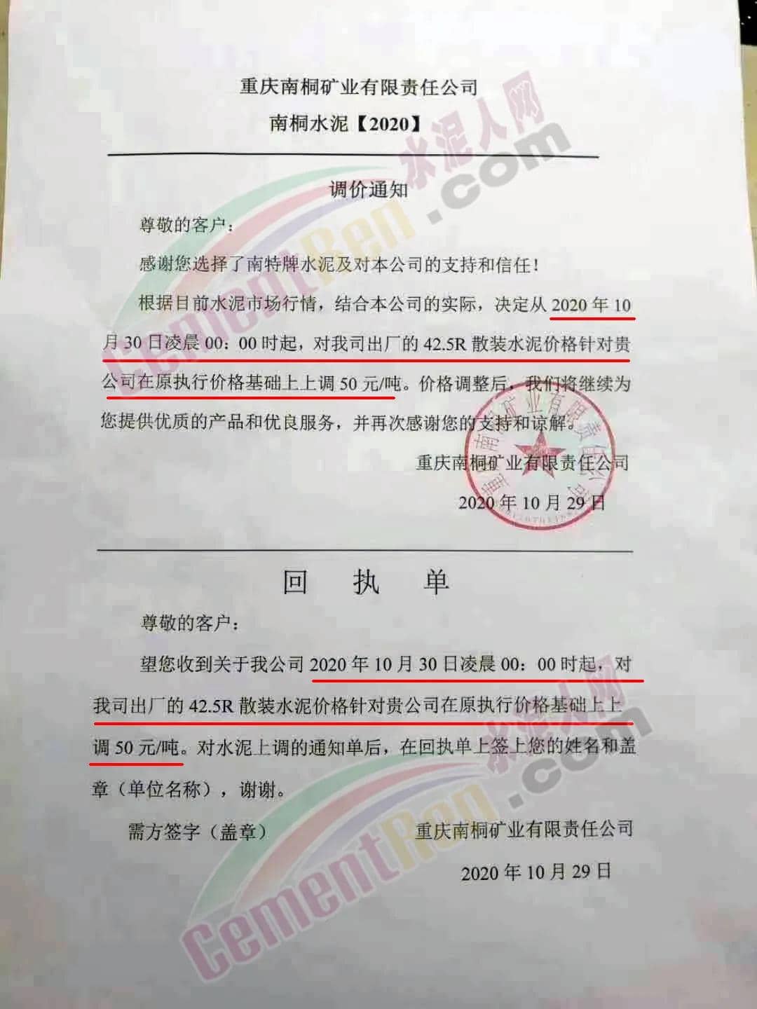 10月29日重慶南銅礦業(yè)通知自10月30日起,公司出廠的42.5R散裝水泥上調50元/噸。