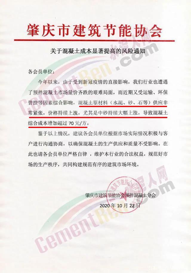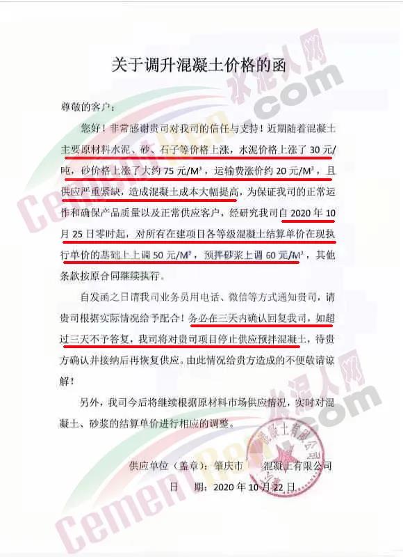 肇慶某混凝土公司發(fā)函通知稱,近期隨著混凝土主要原材料水泥、砂、石子等價格上漲,水泥價格上漲了30元/噸,砂價格上漲了大約75元/m³,運輸費漲價約20元/m³,且供應嚴重緊缺,造成混凝土成本大幅提高,為保證公司的正常運作和確保產品質量以及正常供應客戶,經研究公司自2020年10 月25日零時起,對所有在建項目各等級混凝土結算單價在現執(zhí)行單價的基礎上上調50元/m³,預拌砂漿上調60元/m³,其他條款按原合同繼續(xù)執(zhí)行。