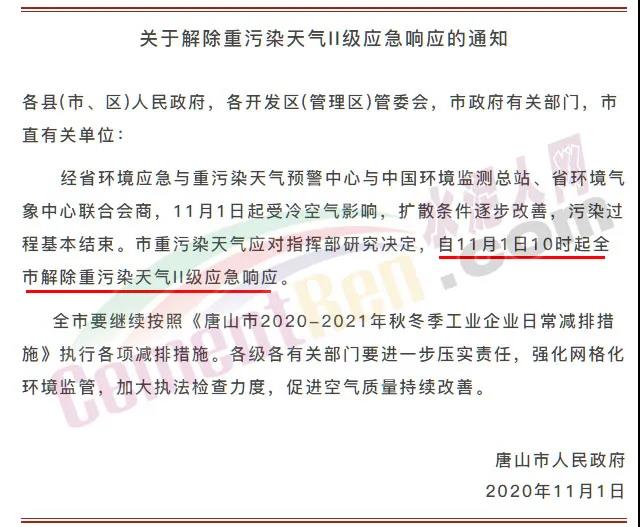 同日,河北唐山市政府也發(fā)布了《關(guān)于解除重污染天氣II級(jí)應(yīng)急響應(yīng)的通知》稱經(jīng)省環(huán)境應(yīng)急與重污染天氣預(yù)警中心與中國(guó)環(huán)境監(jiān)測(cè)總站、省環(huán)境氣象中心聯(lián)合會(huì)商,11月1日起受冷空氣影響,擴(kuò)散條件逐步改善,污染過(guò)程基本結(jié)束。市重污染天氣應(yīng)對(duì)指揮部研究決定,自11月1日10時(shí)起全市解除重污染天氣II級(jí)應(yīng)急響應(yīng)。