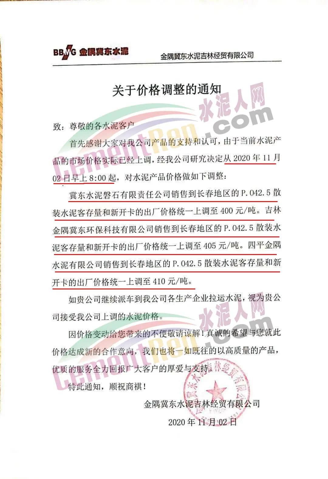 四平金隅水泥有限公司銷售到長春地區(qū)的P.042.5散裝水泥客存量和新開卡的出廠價格統(tǒng)一上調(diào)至410元/噸。