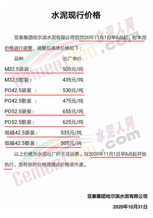 11月1日東北黑龍江區(qū)域主要品牌企業(yè)亞泰集團(tuán)哈爾濱水泥公司通知11月1日早8點上調(diào)水泥價格,上調(diào)后多個品種標(biāo)號水泥中不含運(yùn)費出廠單突破500元/噸,其中PO52.5散裝水泥報價625元/噸,PO52.5袋裝水泥報價655元/噸,M32.5袋裝水泥報價505元/噸,PO42.5袋裝水泥530元/噸。
