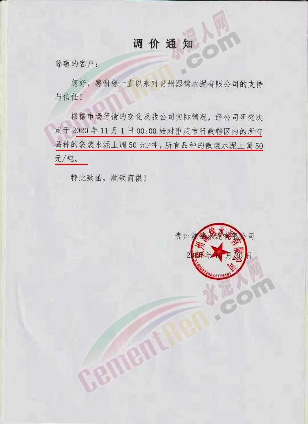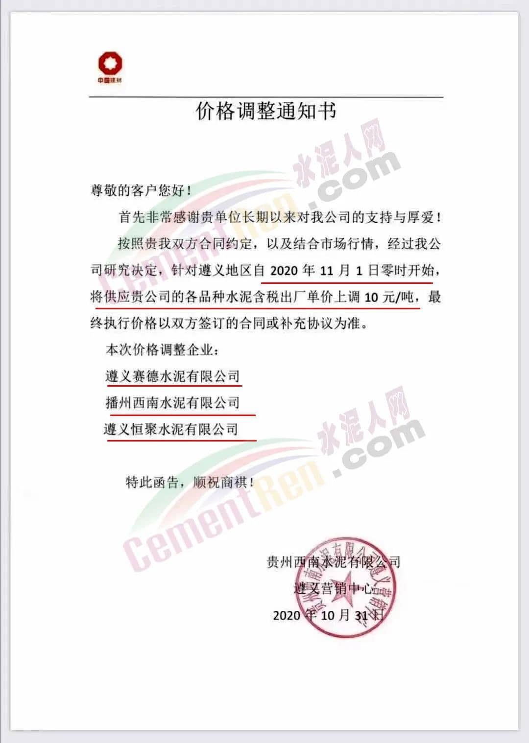 同期,貴州遵義區(qū)域主要品牌企業(yè)西南水泥旗下遵義賽德水泥、播州西南水泥、遵義恒水泥三家工廠通知各品種水泥含稅出廠價上調(diào)10元/噸。