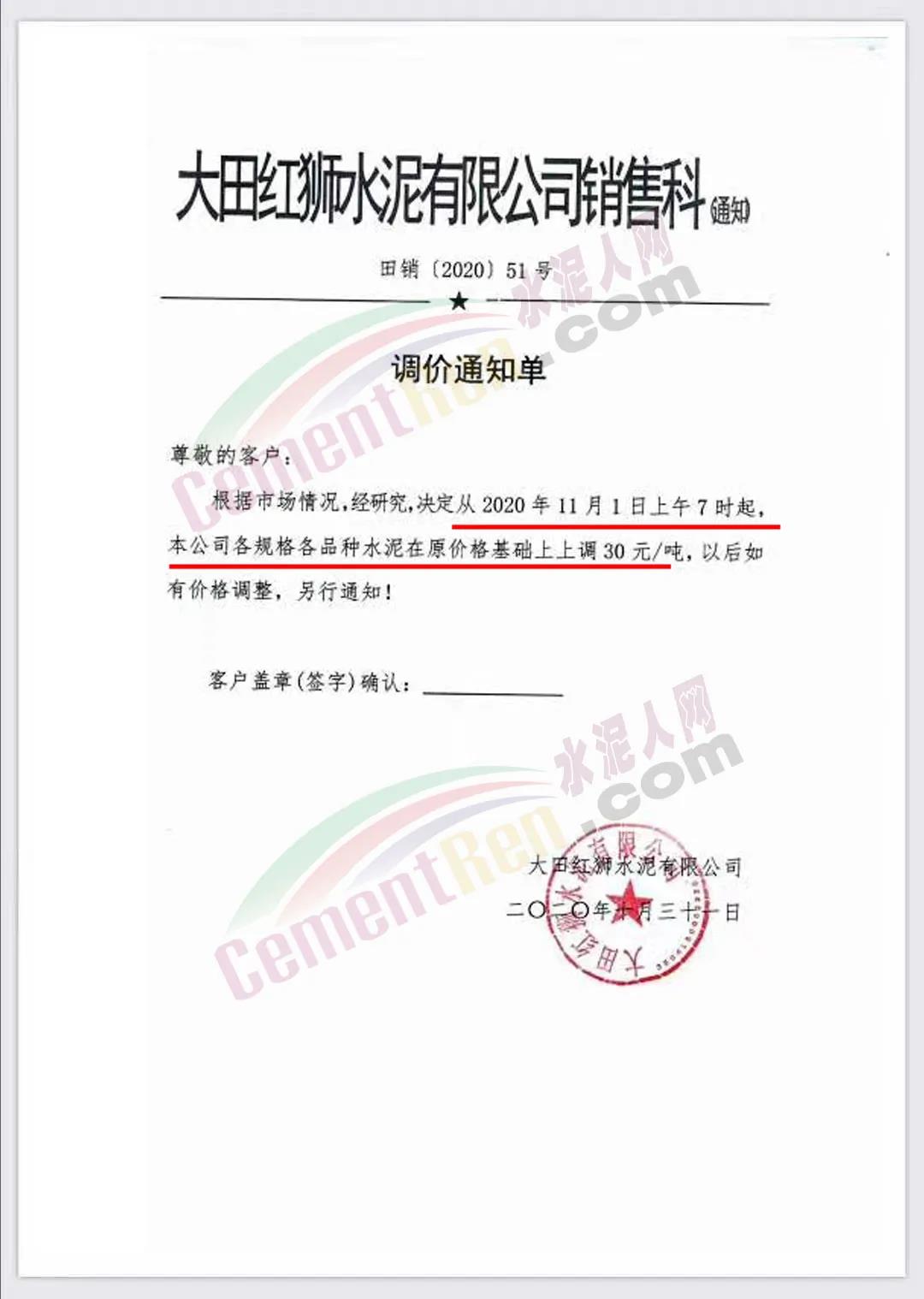 黑龍江賓州水泥有限公司也通知11月1日8時起上調(diào)水泥價格,漲價后M32.5袋裝水泥執(zhí)行445元/噸,PO42.5水泥執(zhí)行485元/噸,M32.5散裝水泥執(zhí)行425元/噸,PO42.5散裝執(zhí)行465元/噸。