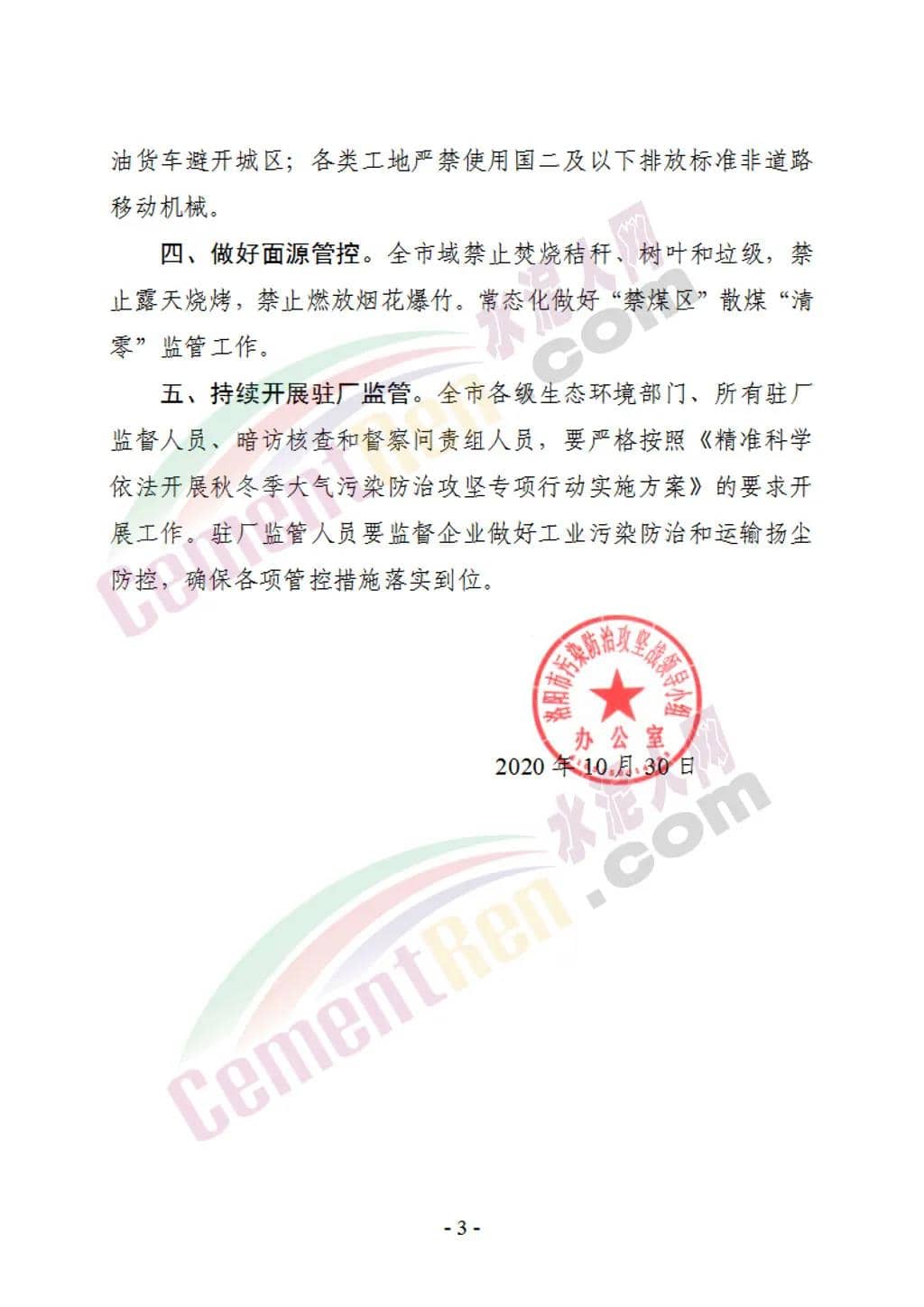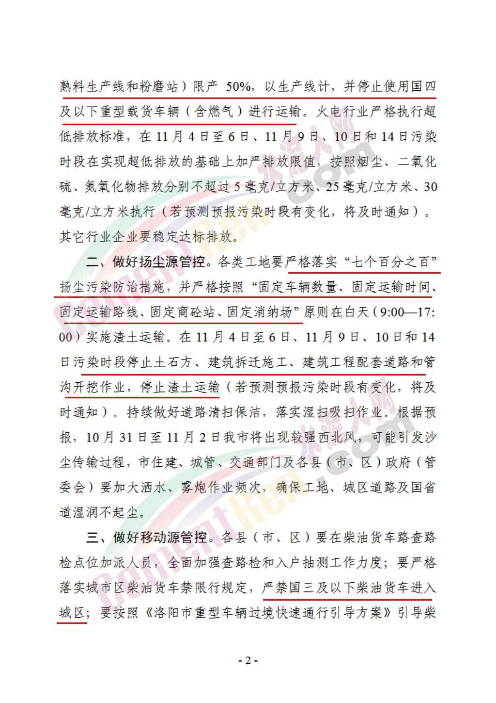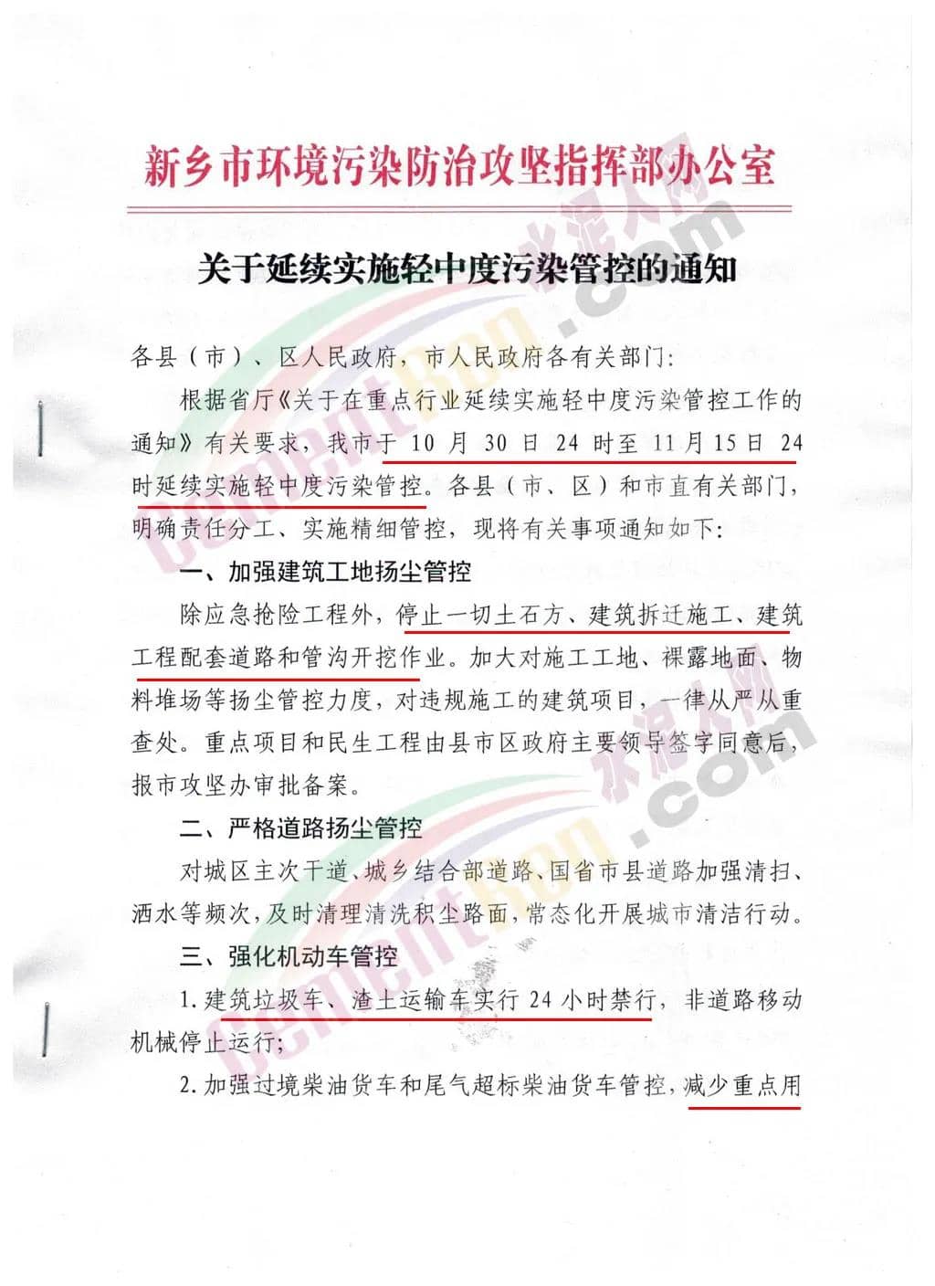 各類工地要嚴格落實“七個百分之百”揚塵污染防治措施,并嚴格按照“固定車輛數(shù)量、固定運輸時間、固定運輸路線、固定商砼站、固定消納場”原則在白天(9:0—17:00)實施渣土運輸。在11月4日至6日、11月9日、10日和14 日污染時段停止土石方、建筑拆遷施工、建筑工程配套道路和管溝開挖作業(yè),停止渣土運輸。通知原文如下: