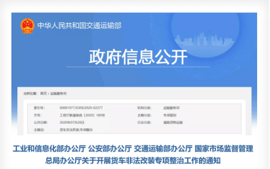 按照國(guó)務(wù)院安委會(huì)《全國(guó)安全生產(chǎn)專(zhuān)項(xiàng)整治三年行動(dòng)計(jì)劃》(以下簡(jiǎn)稱(chēng)《行動(dòng)計(jì)劃》)部署和《道路運(yùn)輸安全專(zhuān)項(xiàng)整治三年行動(dòng)實(shí)施方案》(以下簡(jiǎn)稱(chēng)《實(shí)施方案》)要求,工業(yè)和信息化部、公安部、交通運(yùn)輸部、市場(chǎng)監(jiān)管總局決定自2020年7月至2021年5月組織開(kāi)展貨車(chē)非法改裝專(zhuān)項(xiàng)整治工作,預(yù)防和遏制貨車(chē)非法改裝行為,保障道路運(yùn)輸安全。具體事項(xiàng)通知如下。