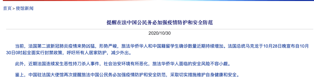 10月30日,中國駐法國大使館發(fā)布消息,再次提醒旅法中國公民務(wù)必加強(qiáng)疫情防護(hù)和安全防范,采取切實(shí)措施維護(hù)自身健康和安全。