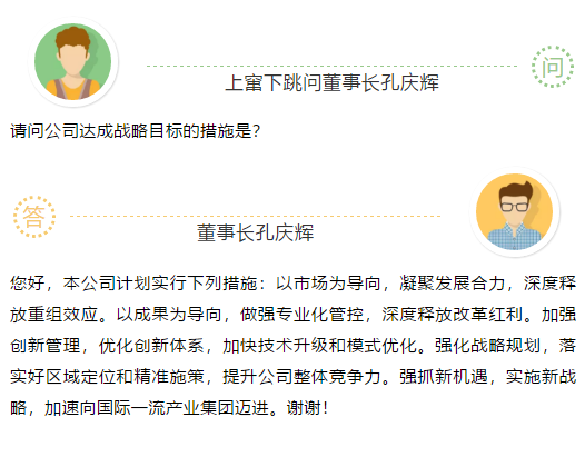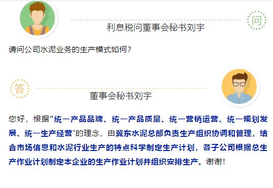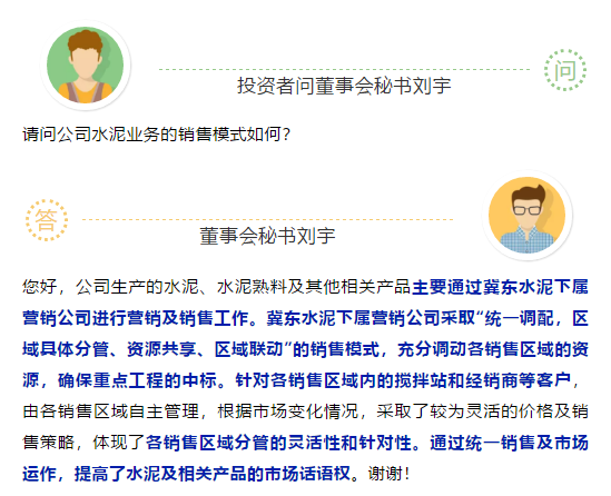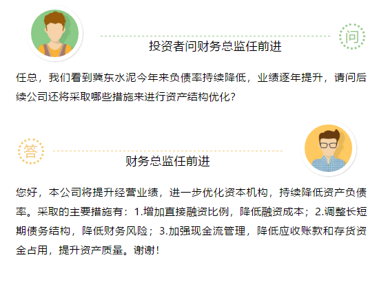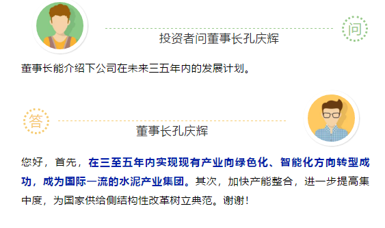 5.成本優(yōu)勢(shì):公司持續(xù)做實(shí)做優(yōu)生產(chǎn)運(yùn)營(yíng)管控,為實(shí)現(xiàn)高質(zhì)量發(fā)展,持續(xù)推進(jìn)“培優(yōu)”工作,以培優(yōu)為平臺(tái)的對(duì)標(biāo)、總結(jié)、互相借鑒、 學(xué)習(xí),營(yíng)造了標(biāo)桿引領(lǐng)、爭(zhēng)先創(chuàng)優(yōu)的地良好企業(yè)發(fā)展氛圍;持續(xù)加大技改投入,以篦冷機(jī)、預(yù)熱器、預(yù)粉磨設(shè)備等主機(jī)提效 為重點(diǎn)加速消除落后工藝、低效裝備;引進(jìn)、推廣成熟、有效的節(jié)能降耗技術(shù)措施,降耗能力提升;持續(xù)推進(jìn)直供電工作, 成本控降效果顯著;結(jié)合各區(qū)域產(chǎn)品質(zhì)量的差異化需求,按區(qū)域制定質(zhì)量標(biāo)準(zhǔn),著力解決水泥產(chǎn)品面臨的同質(zhì)化、低附加值 等重大共性問(wèn)題,開(kāi)發(fā)適應(yīng)市場(chǎng)的高性能定制化水泥。使得公司在布局區(qū)域的成本競(jìng)爭(zhēng)優(yōu)勢(shì)明顯,為公司產(chǎn)能釋放、效益提升奠定了基礎(chǔ)。6.人才優(yōu)勢(shì):公司堅(jiān)持實(shí)施“人才強(qiáng)企”戰(zhàn)略,培養(yǎng)造就了一批綜合素質(zhì)好的優(yōu)秀經(jīng)營(yíng)管理人才和素質(zhì)一流的高級(jí)專業(yè)技術(shù)人才隊(duì)伍, 建設(shè)了一支符合公司發(fā)展需要的優(yōu)秀年輕骨干人才梯隊(duì);通過(guò)引進(jìn)科技領(lǐng)軍人才、高級(jí)技術(shù)專家等高端優(yōu)秀人才,匯聚高端智力資源,充分發(fā)揮高層次人才在推動(dòng)公司發(fā)展的引領(lǐng)作用。報(bào)告期,公司人才結(jié)構(gòu)持續(xù)優(yōu)化、布局更加合理,一批職業(yè)素 養(yǎng)好、開(kāi)拓能力強(qiáng)的經(jīng)營(yíng)管理人員成為公司人才競(jìng)爭(zhēng)的比較優(yōu)勢(shì)。謝謝!