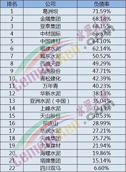 負(fù)債率往往也是觀測(cè)一個(gè)企業(yè)發(fā)展與活力的重要數(shù)據(jù),負(fù)債率太高或者太低,對(duì)于企業(yè)來說都不是一個(gè)好苗頭。排名整體看來大部分企業(yè)的負(fù)債率都在正常范圍內(nèi),除了第一名的葛洲壩,負(fù)債率達(dá)到了71.59%;第二名的金隅集團(tuán)與第三名的亞泰集團(tuán)負(fù)債率分別達(dá)到了68.18%和68.15%,第四名中材國際為66.37%,第五名中國建材為64.10%,海螺水泥處于倒數(shù)第三名,有19.86%的負(fù)債率,塔牌集團(tuán)倒數(shù)第二為15.14%,四川雙馬是最后一名,負(fù)債率低至6.6%。