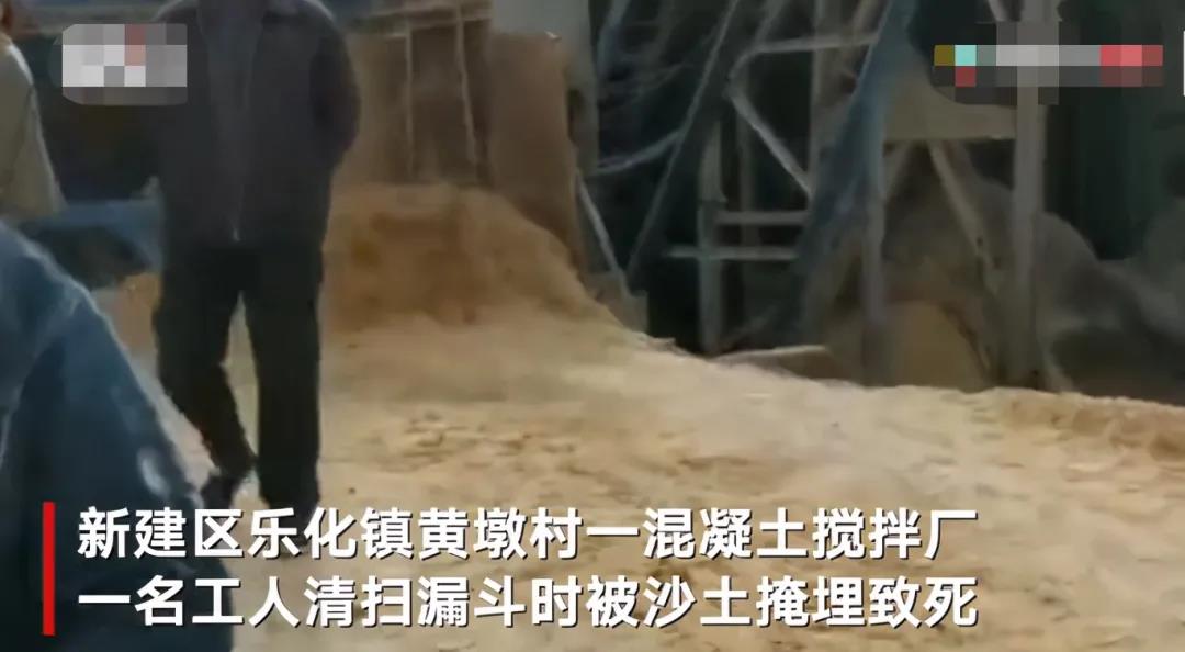 11月4日,江西南昌新建區(qū)樂化鎮(zhèn)黃墩村一混凝土攪拌廠,一名工人清掃漏斗時(shí)被沙土掩埋致死。視頻拍攝者稱,攪拌廠系無證經(jīng)營。