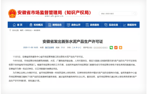 11月5日,安徽省政務服務中心省市場監(jiān)管局窗口發(fā)出首張水泥產(chǎn)品生產(chǎn)許可證。
