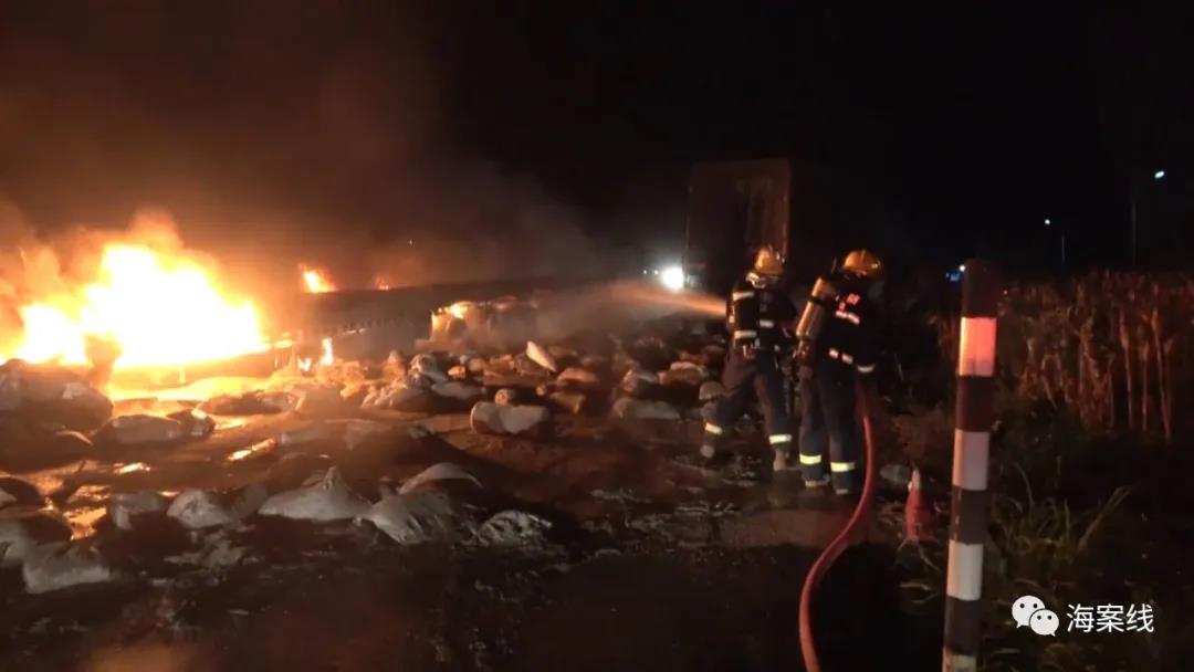 消防員立即兵分兩路開展救援工作,一組人利用消防車出水撲滅水泥掛車的明火,搶救被困人員;另一組人利用破拆器材對化肥貨車的車頭進(jìn)行破拆,搶救被困駕駛員。經(jīng)過緊急撲救,現(xiàn)場火勢很快得到控制。3點30分,明火被撲滅,5點10分,貨車內(nèi)被困駕駛員救出,經(jīng)現(xiàn)場醫(yī)務(wù)人員確認(rèn)已無生命跡象,而水泥掛車的兩名被困人員因火勢燃燒猛烈,也不幸身亡。此外,貨車和掛車上各有一人在本次事故中受傷。