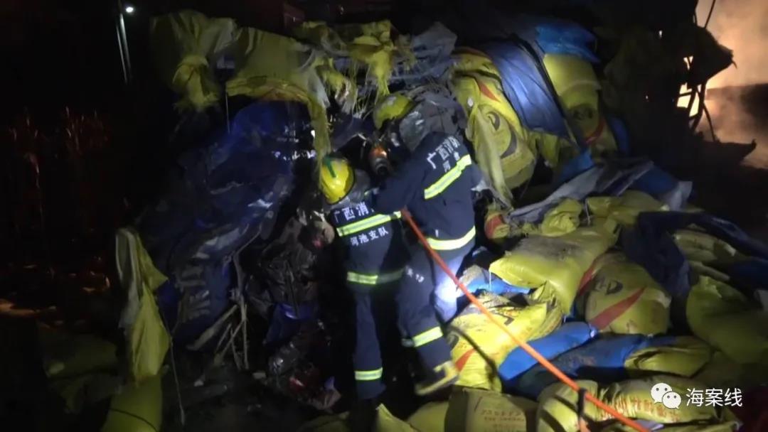 當(dāng)天凌晨2點51分,都安安陽消防救援站接到警情后,立即趕赴現(xiàn)場救援。在事故現(xiàn)場,一輛運載水泥的掛車與一輛運載化肥的貨車迎面相撞,水泥掛車燃起熊熊大火,兩人被困火中無法逃生;運化肥的貨車則是側(cè)翻在一旁,車頭已嚴(yán)重變形,一人被困駕駛室內(nèi),情況十分緊急。