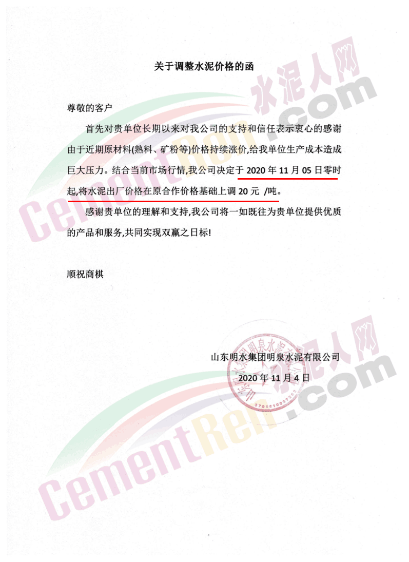 山東明水集團(tuán)明泉水泥有限公司水泥調(diào)價(jià)函稱,由于近期原材料(熟料、礦粉等)價(jià)格持續(xù)漲價(jià),給企業(yè)生產(chǎn)成本造成巨大壓力。結(jié)合當(dāng)前市場(chǎng)行情,決定于2020年11月05日零時(shí)起,將水泥出廠價(jià)格在原合作價(jià)格基礎(chǔ)上調(diào)20元 /噸。