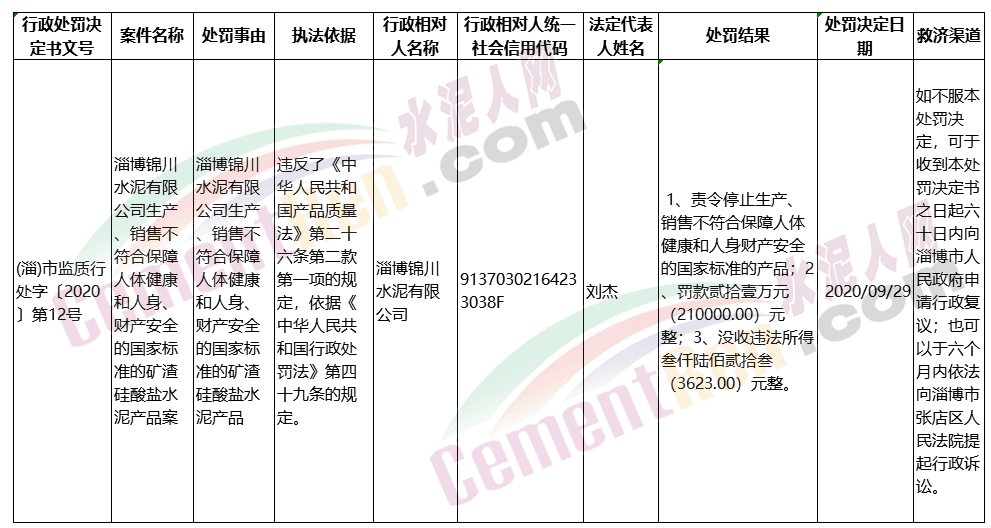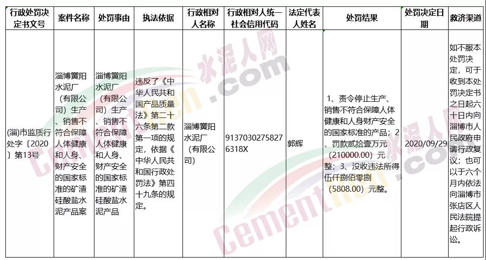 淄博黌陽水泥廠(有限公司)生產(chǎn)、銷售不符合保障人體健康和人身、財產(chǎn)安全的國家標(biāo)準(zhǔn)的礦渣硅酸鹽水泥產(chǎn)品案,違反了《中華人民共和國產(chǎn)品質(zhì)量法》第二十六條第二款第一項的規(guī)定,依據(jù)《中華人民共和國行政處罰法》第四十九條的規(guī)定。處罰結(jié)果: 1、責(zé)令停止生產(chǎn)、銷售不符合保障人體健康和人身財產(chǎn)安全的國家標(biāo)準(zhǔn)的產(chǎn)品;2、罰款貳拾壹萬元(210000.00)元整;3、沒收違法所得伍仟捌佰零捌(5808.00)元整。