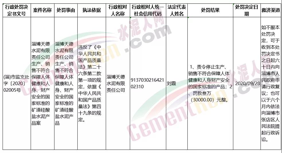 淄博天德水泥有限責(zé)任公司生產(chǎn)、銷售不符合保障人體健康和人身、財產(chǎn)安全的國家標(biāo)準(zhǔn)的礦渣硅酸鹽水泥產(chǎn)品案。淄博天德水泥有限責(zé)任公司違反了《中華人民共和國產(chǎn)品質(zhì)量法》第二十六條第二款第一項的規(guī)定,依據(jù)《中華人民共和國產(chǎn)品質(zhì)量法》第四十九條的規(guī)定。處罰結(jié)果:1、責(zé)令停止生產(chǎn)、銷售不符合保障人體健康和人身財產(chǎn)安全的國家標(biāo)準(zhǔn)的產(chǎn)品;2、罰款叁萬(30000.00)元整。