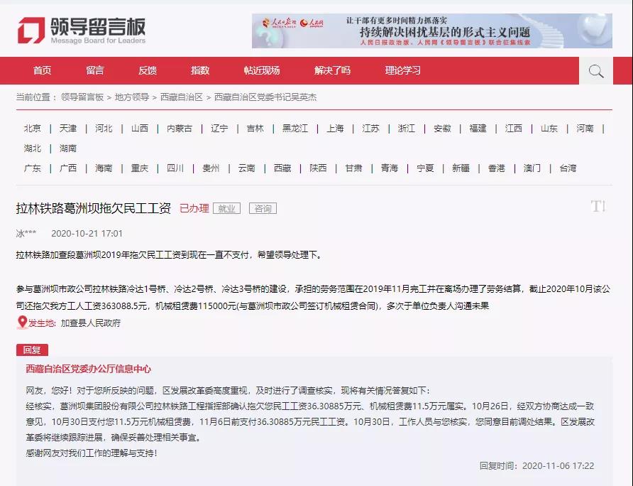 西藏自治區(qū)黨委辦公廳信息中心回復(fù)稱:“網(wǎng)友,您好!對于您所反映的問題,區(qū)發(fā)展改革委高度重視,及時進行了調(diào)查核實,現(xiàn)將有關(guān)情況答復(fù)如下:經(jīng)核實,葛洲壩集團股份有限公司拉林鐵路工程指揮部確認(rèn)拖欠您民工工資36.30885萬元、機械租賃費11.5萬元屬實。10月26日,經(jīng)雙方協(xié)商達成一致意見,10月30日支付您11.5萬元機械租賃費,11月6日前支付36.30885萬元民工工資。10月30日,工作人員與您核實,您同意目前調(diào)處結(jié)果。區(qū)發(fā)展改革委將繼續(xù)跟蹤進展,確保妥善處理相關(guān)事宜。感謝網(wǎng)友對我們工作的理解與支持!”