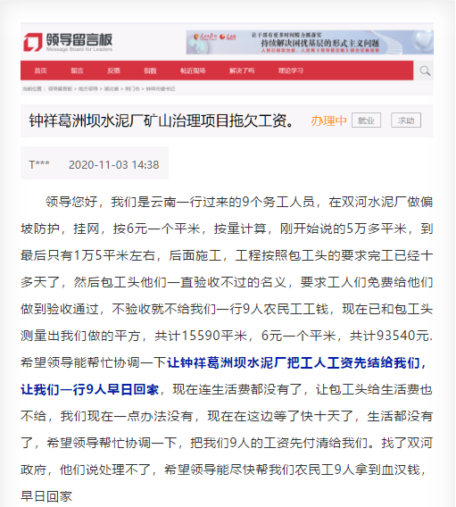 葛洲壩拖欠工資并非個例,11月3日,另一網(wǎng)友在人民網(wǎng)《領(lǐng)導(dǎo)留言板》留言稱,云南來的一行9人,在雙河水泥廠做偏坡防護,掛網(wǎng),按6元一個平米,按量計算,剛開始說的5萬多平米,到最后只有1萬5平米左右,后面施工,工程按照包工頭的要求完工已經(jīng)十多天了,然后包工頭他們一直驗收不過的名義,要求工人們免費給他們做到驗收通過,不驗收就不給農(nóng)民工工錢,現(xiàn)在已和包工頭測量出共計15590平米,6元一個平米,共計93540元。希望領(lǐng)導(dǎo)能幫忙協(xié)調(diào)一下讓鐘祥葛洲壩水泥廠把工人工資先結(jié)給大家,讓9名工人早日回家。工人現(xiàn)在連生活費都沒有了。已經(jīng)等了快十天了,希望領(lǐng)導(dǎo)幫忙協(xié)調(diào)一下,把9名工人的工資先付清。已經(jīng)找過雙河政府,他們說處理不了,希望領(lǐng)導(dǎo)能盡快幫農(nóng)民工拿到血漢錢。