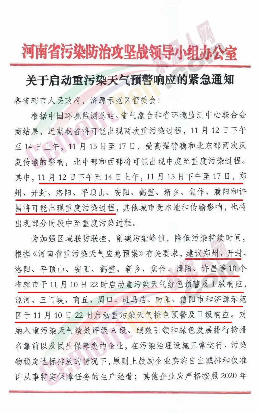 鄭州、開封、 洛陽、平頂山、安陽、鶴壁、新鄉(xiāng)、焦作、濮陽、許昌等10個省轄市于11月10日22時啟動重污染天氣紅色預(yù)警及I級響應(yīng)。漯河、三門峽、商丘、周口、駐馬店、南陽、信陽市和濟(jì)源示范區(qū)于11月10日22時啟動重污染天氣橙色預(yù)警及II級響應(yīng)。對納入重污染天氣績效評級A級、績效引領(lǐng)和綠色發(fā)展排行榜排 名靠前以及民生保障類的企業(yè),在污染治理設(shè)施正常運(yùn)行、污染物穩(wěn)定達(dá)標(biāo)排放的情況下,原則上鼓勵企業(yè)實(shí)施自主減排和僅準(zhǔn)許從事特定保障任務(wù)的生產(chǎn)經(jīng)營;其他企業(yè)應(yīng)嚴(yán)格按照2020年重污染天氣應(yīng)急減排清單實(shí)施相應(yīng)級別管控措施。應(yīng)急搶險、重大民生工程和重點(diǎn)項目,在嚴(yán)格落實(shí)“六個百分之百”施工要求 的前提下,可正常施工。 重污染天氣預(yù)警期間,請各地重點(diǎn)加強(qiáng)對城市建成區(qū)及周邊排污企業(yè)的管控力度,對應(yīng)停未停、應(yīng)限不限、預(yù)警前故意抬高排放量及用電量,或借“出于安全考慮無法停下來” “設(shè)備調(diào)試、 檢修”名義規(guī)避管控的企業(yè)依法依規(guī)嚴(yán)格處理。各地要主動對社會發(fā)聲,提醒公眾做好健康防護(hù)措施,倡導(dǎo)公眾低碳生活、綠色消費(fèi),單位和公眾盡量減少含揮發(fā)性有機(jī)物的涂料、油漆、溶劑 等原材料和產(chǎn)品的使用,自覺接受社會監(jiān)督,同心協(xié)力做好重污 染天氣應(yīng)急應(yīng)對工作。通知原文如下: