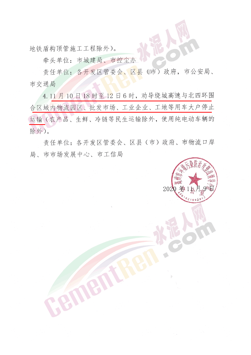 3. 繞城髙速與北四環(huán)圍合區(qū)域內(nèi)及滎陽市,11月9日20時至13日24時停止商砼罐車運(yùn)輸;11月9日20時至12日12時,工地及混凝土攪拌站停止物料車運(yùn)輸。4