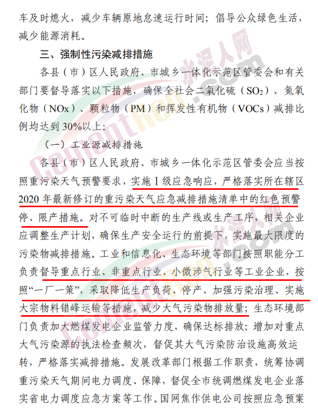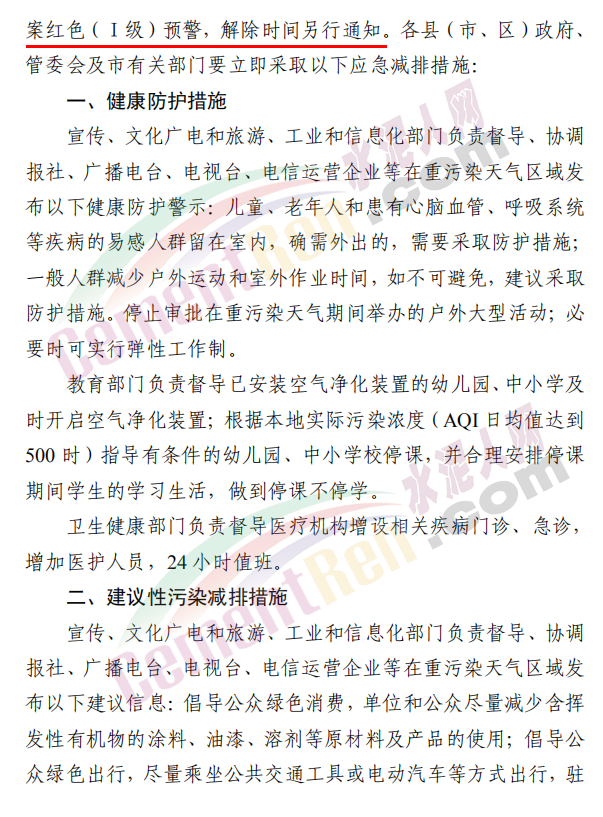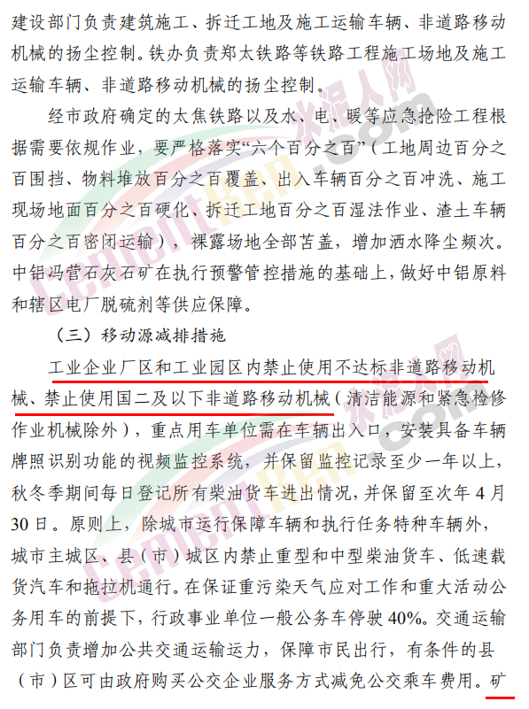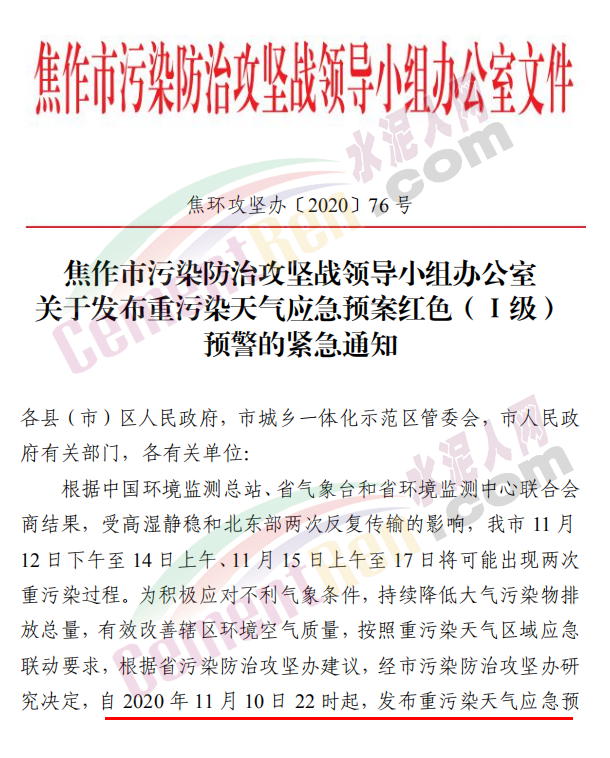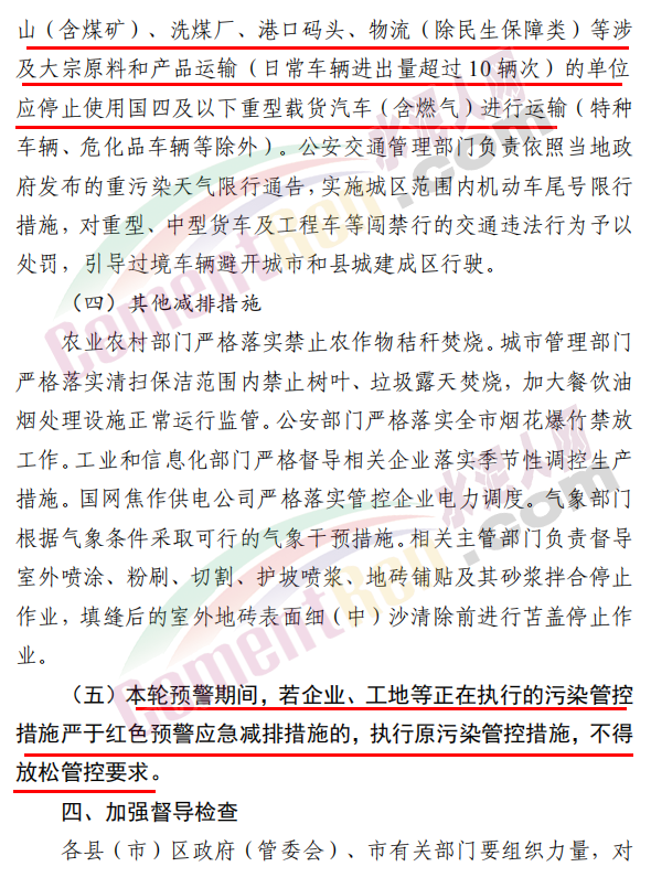 焦作市污染防治攻堅戰(zhàn)領(lǐng)導(dǎo)小組辦公室發(fā)布《關(guān)于發(fā)布重污染天氣應(yīng)急預(yù)案紅色(Ⅰ級)預(yù)警的緊急通知》稱,根據(jù)省污染防治攻堅辦建議,經(jīng)焦作市污染防治攻堅辦研究決定,自 2020 年 11 月 10 日 22 時起,發(fā)布重污染天氣應(yīng)急預(yù)案紅色(Ⅰ級)預(yù)警,解除時間另行通知。各縣(市、區(qū))政府、 管委會及市有關(guān)部門要立即采取應(yīng)急減排措施。工業(yè)源減排措施方面要求各縣(市)區(qū)人民政府、市城鄉(xiāng)一體化示范區(qū)管委會應(yīng)當(dāng)按 照重污染天氣預(yù)警要求,實(shí)施Ⅰ級應(yīng)急響應(yīng),嚴(yán)格落實(shí)所在轄區(qū)2020 年最新修訂的重污染天氣應(yīng)急減排措施清單中的紅色預(yù)警停、限產(chǎn)措施。不可臨時中斷的生產(chǎn)線或生產(chǎn)工序,相關(guān)企業(yè)應(yīng)調(diào)整生產(chǎn)計劃,確保生產(chǎn)安全運(yùn)行的前提下,實(shí)施最大限度的污染物減排措施。預(yù)警期間,嚴(yán)禁工業(yè)企業(yè)新開生產(chǎn)線或運(yùn)行新的生產(chǎn)設(shè)備, 對于重污染天氣績效評級 A 級、績效引領(lǐng)、民生保障等企業(yè), 原則上鼓勵企業(yè)自主減排和僅準(zhǔn)許特定保障任務(wù)的生產(chǎn)經(jīng)營。長期停產(chǎn)及未建成企業(yè)復(fù)產(chǎn)或試生產(chǎn)前,須向縣(區(qū))、市兩級污染防治攻堅辦報告,經(jīng)同意后方可進(jìn)行。揚(yáng)塵源減排措施方面要求礦山、砂石料廠、石材廠、石板廠等應(yīng)停止露天作業(yè);施工工地停止室外作業(yè)。建筑垃圾清運(yùn)車輛和砂石運(yùn)輸車輛禁止上路行駛。開挖土石方的挖掘機(jī)等非道路移動機(jī)械停止作業(yè)。施工工地內(nèi)停止使用國二及以下非道路移動機(jī)械。移動源減排措施要求工業(yè)企業(yè)廠區(qū)和工業(yè)園區(qū)內(nèi)禁止使用不達(dá)標(biāo)非道路移動機(jī)械、禁止使用國二及以下非道路移動機(jī)械,重點(diǎn)用車單位需在車輛出入口,安裝具備車輛牌照識別功能的視頻監(jiān)控系統(tǒng),并保留監(jiān)控記錄至少一年以上, 秋冬季期間每日登記所有柴油貨車進(jìn)出情況,并保留至次年4月30日。礦山(含煤礦)、洗煤廠、港口碼頭、物流等涉及大宗原料和產(chǎn)品運(yùn)輸?shù)膯挝粦?yīng)停止使用國四及以下重型載貨汽車(含燃?xì)?進(jìn)行運(yùn)輸。本輪預(yù)警期間,若企業(yè)、工地等正在執(zhí)行的污染管控措施嚴(yán)于紅色預(yù)警應(yīng)急減排措施的,執(zhí)行原污染管控措施,不得放松管控要求。