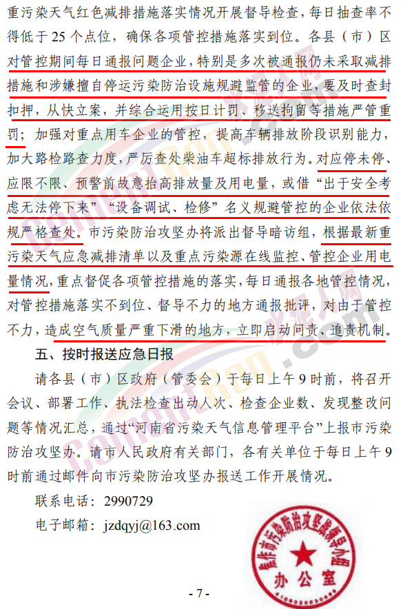加強(qiáng)對重點(diǎn)用車企業(yè)的管控,提高車輛排放階段識別能力, 加大路檢路查力度,嚴(yán)厲查處柴油車超標(biāo)排放行為。對應(yīng)停未停、 應(yīng)限不限、預(yù)警前故意抬高排放量及用電量,或借“出于安全考慮無法停下來”“設(shè)備調(diào)試、檢修”名義規(guī)避管控的企業(yè)依法依規(guī)嚴(yán)格查處。市污染防治攻堅辦將派出督導(dǎo)暗訪組,根據(jù)最新重污染天氣應(yīng)急減排清單以及重點(diǎn)污染源在線監(jiān)控、管控企業(yè)用電量情況,重點(diǎn)督促各項管控措施的落實(shí),每日通報各地管控情況,對管控措施落實(shí)不到位、督導(dǎo)不力的地方通報批評,對由于管控不力,造成空氣質(zhì)量嚴(yán)重下滑的地方,立即啟動問責(zé)、追責(zé)機(jī)制。