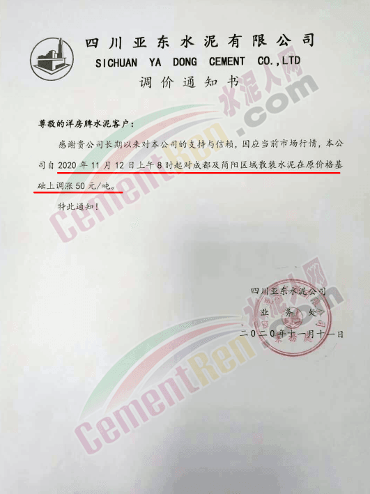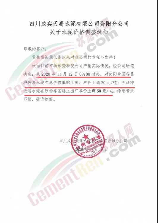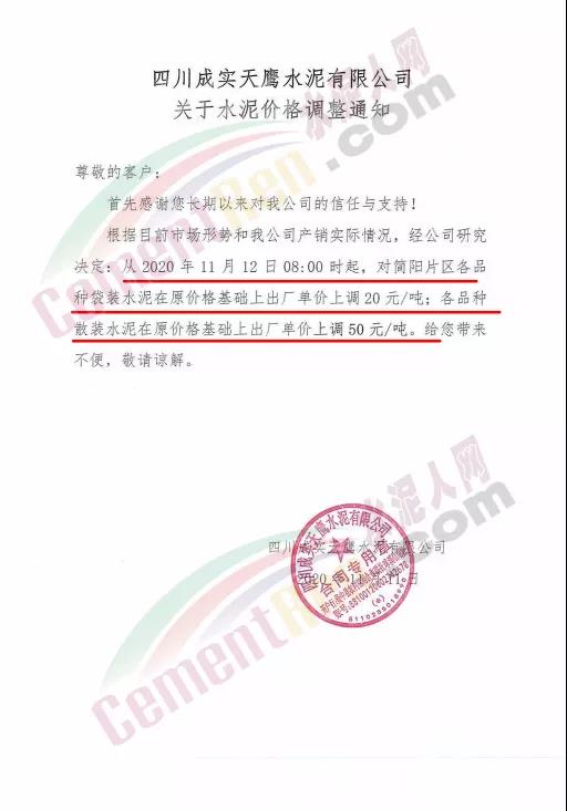 四川成實天鷹水泥、四川成實天鷹水泥資陽分公司等通知自12日起上午8時起,對簡陽片區(qū)各品種袋裝水泥出廠價上調(diào)20元/噸。各品種散裝水泥上調(diào)50元/噸。
