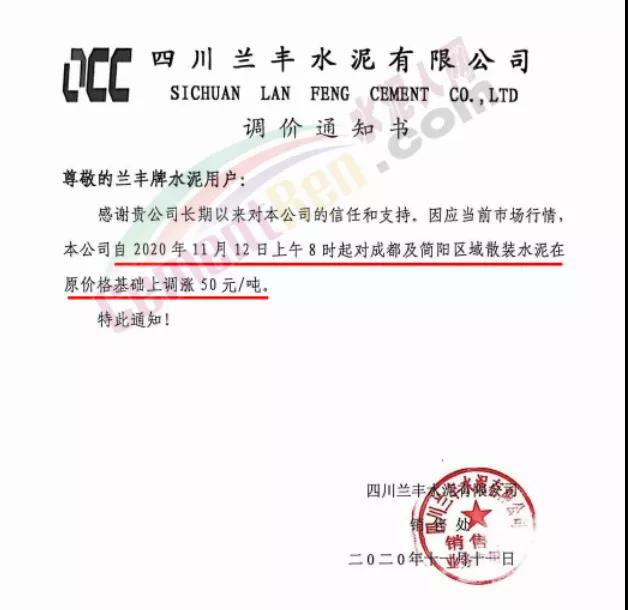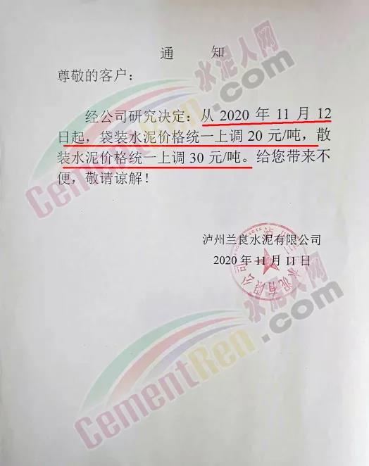 瀘州蘭良水泥有限公司通知自11月12日起,袋裝水泥統(tǒng)一上調(diào)20元/噸,散裝水泥價格統(tǒng)一上調(diào)30元/噸。
