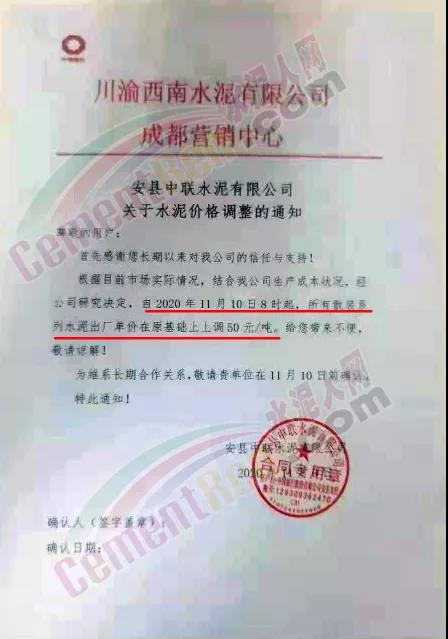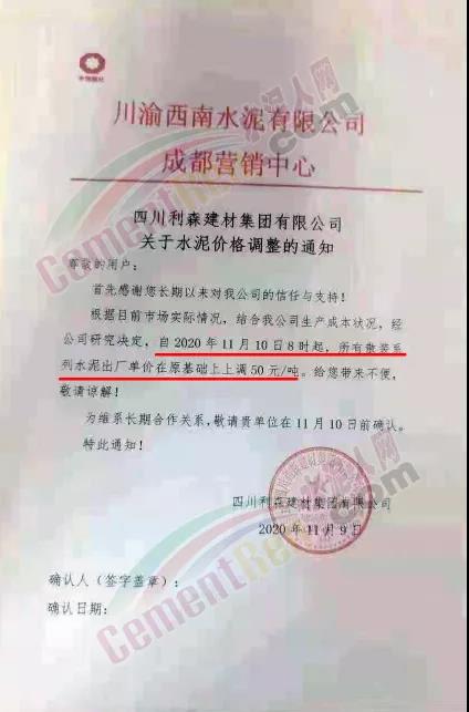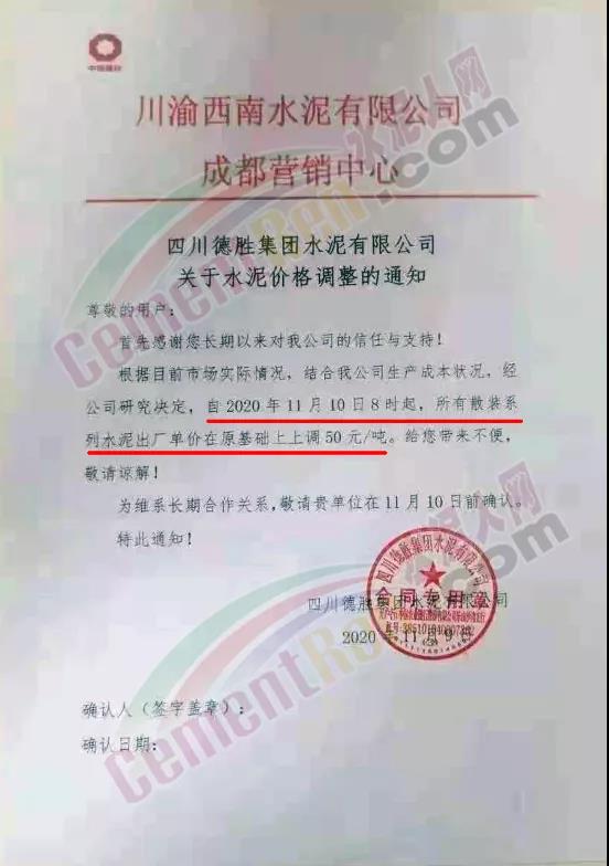 四川峨勝水泥通知自11月12日零時起,對成都區(qū)域所有袋裝水泥上調(diào)20元/噸。